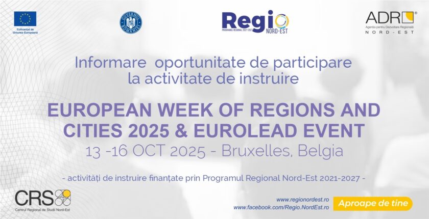 Agenția pentru Dezvoltare Regională Nord-Est, prin Centrul Regional de Studii, vă invită să participați la unul dintre cele mai importante evenimente europene dedicate dezvoltării regionale și urbane: Săptămâna Europeană a Regiunilor și Orașelor și la evenimentul EUROLEAD, ce vor avea loc în perioada 13–16 octombrie 2025, la Bruxelles, Belgia.